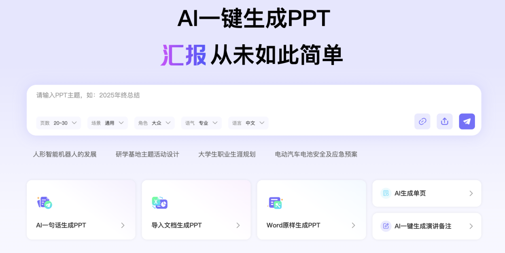 | 输入主题生成 | 没有现成内容,需要快速出框架和内容 | 15秒生成完整PPT,自带逻辑框架,适合紧急汇报、方案初稿 |