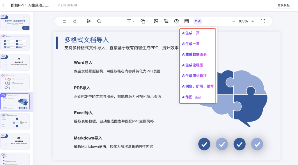 - AI生成图表:适合展示销售数据、项目进度等定量内容,自动匹配最优图表类型