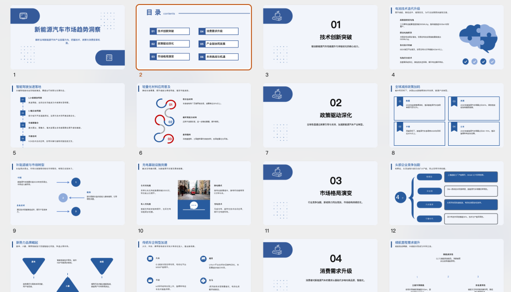 示例:假设你要做一个“新能源汽车市场趋势”的PPT。你可能会写下: