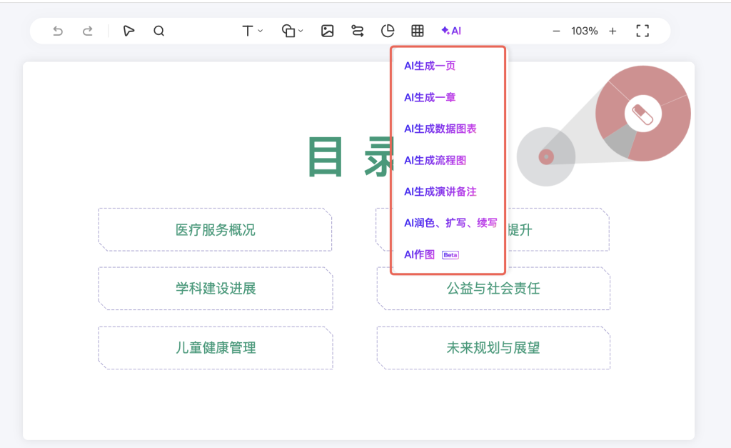 • 一键生成演讲备注:不知道汇报的时候说什么,点击就能生成每一页的演讲词,新手也能流畅做完汇报。